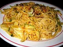 Burmese salads, transliterated as a thoke, thohk or thouk, are part of Burmese cuisine. The salads include rice, noodle, potato, ginger, tomato, kaffir lime, long bean, lahpet (pickled tea leaves), and ngapi (fish paste) salads. They are popular as fast foods in Burmese cities. Burmese noodle salads include wheat noodles or rice noodles. Fermented tea leaf and pickled ginger are two classic dishes.[1]