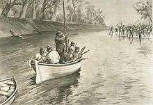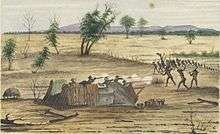 Opinions differ on whether to depict the conflict as one sided and mainly perpetrated by Europeans on Indigenous Australians or not. Although tens of thousands more Indigenous Australians died than Europeans, some cases of mass killing were not massacres but military defeats, and the higher death toll may in some cases have had more to do with the technological and logistic advantages enjoyed by Europeans.[22] Indigenous tactics varied, but were mainly based on pre-existing hunting and fighting practices—utilising spears, clubs and other primitive weapons. Unlike the indigenous peoples of New Zealand and North America, on the main they failed to adapt to meet the challenge of the Europeans, and although there were some instances of individuals and groups acquiring and using firearms, this was not widespread.[24] In reality the Indigenous peoples were never a serious military threat, regardless of how much the settlers may have feared them.[25] On occasions large groups attacked Europeans in open terrain and a conventional battle ensued, during which the Aborigines would attempt to use superior numbers to their advantage. This could sometimes be effective, with reports of them advancing in crescent formation in an attempt to outflank and surround their opponents, waiting out the first volley of shots and then hurling their spears whilst the settlers reloaded. Usually, however, such open warfare proved more costly for the Indigenous Australians than the Europeans.[26]