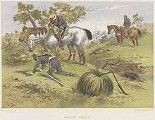 ![]() Mounted police engaging Indigenous Australians during the Slaughterhouse Creek Massacre of 1838 | |||||