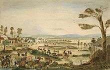 During the 1790s and early 19th century the British established small settlements along the Australian coastline. These settlements initially occupied small amounts of land, and there was little conflict between the settlers and Indigenous peoples. Fighting broke out when the settlements expanded, however, disrupting traditional Indigenous food-gathering activities, and subsequently followed the pattern of European settlement in Australia for the next 150 years.[20] Indeed whilst the reactions of the Aboriginal inhabitants to the sudden arrival of British settlers were varied, they became inevitably hostile when their presence led to competition over resources, and to the occupation of their lands. European diseases decimated Indigenous populations, and the occupation or destruction of lands and food resources sometimes led to starvation.[21] By and large neither the Europeans nor the Indigenous peoples approached the conflict in an organised sense, with the conflict more one between groups of settlers and individual tribes rather than systematic warfare, even if at times it did involve British soldiers and later formed mounted police units. Not all Indigenous Australians resisted white encroachment on their lands either, whilst many also served in mounted police units and were involved in attacks on other tribes.[21] Regardless a pattern of frontier warfare emerges, with Indigenous resistance beginning in the 18th century and continuing into the early 20th century, belying the "myth" of peaceful settlement in Australia. Settlers in turn often reacted with violence, resulting in a number of indiscriminate massacres.[22][23]
