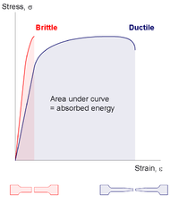A material is brittle if, when subjected to stress, it breaks without significant deformation (strain). Brittle materials absorb relatively little energy prior to fracture, even those of high strength. Breaking is often accompanied by a snapping sound. Brittle materials include most ceramics and glasses (which do not deform plastically) and some polymers, such as PMMA and polystyrene. Many steels become brittle at low temperatures (see ductile-brittle transition temperature), depending on their composition and processing.