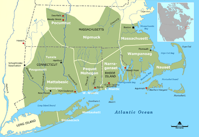 Prior to the arrival of Europeans on the eastern shore of New England, the area around Massachusetts Bay was the territory of several Algonquian-speaking tribes, including the Massachusett, Nauset, and Wampanoag. The Pennacooks occupied the Merrimack River valley to the north, and the Nipmuc, Pocumtuc, and Mahican occupied the western lands of present-day Massachusetts, although some of those tribes were under tribute to the Mohawks, who were expanding aggressively from present-day upstate New York.[2] The total Indian population in 1620 has been estimated to be 7,000[3] with the population of New England at 15–18,000.[4] This number was significantly larger as late as 1616; in later years, contemporary chroniclers interviewed Indians who described a major pestilence that killed between one and two thirds of the population. The land-use patterns of the natives included plots cleared for agricultural purposes, and woodland territories for the hunting of game. Land divisions between the tribes were well understood.[3]