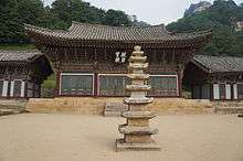 Later Silla was a golden age of art and culture,[70][71][72][73] as evidenced by the Hwangnyongsa, Seokguram, and Emille Bell. Relationships between Korea and China remained relatively peaceful during this time. Later Silla carried on the maritime prowess of Baekje, which acted like the Phoenicia of medieval East Asia,[74] and during the 8th and 9th centuries dominated the seas of East Asia and the trade between China, Korea and Japan, most notably during the time of Jang Bogo; in addition, Silla people made overseas communities in China on the Shandong Peninsula and the mouth of the Yangtze River.[75][76][77][78] Later Silla was a prosperous and wealthy country,[79] and its metropolitan capital of Gyeongju[80] was the fourth largest city in the world.[81][82][83][84] Buddhism flourished during this time, and many Korean Buddhists gained great fame among Chinese Buddhists[85] and contributed to Chinese Buddhism,[86] including: Woncheuk, Wonhyo, Uisang, Musang,[87][88][89][90] and Kim Gyo-gak, a Silla prince whose influence made Mount Jiuhua one of the Four Sacred Mountains of Chinese Buddhism.[91][92][93][94][95] However, Later Silla weakened under internal strife and the revival of Baekje and Goguryeo, which led to the Later Three Kingdoms period in the late 9th century.
