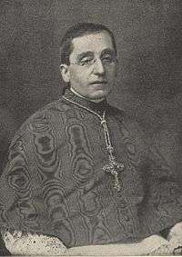 As bishop, he visited all parishes, making a special effort to see the smaller ones in the mountains, which could only be accessed by horse. della Chiesa always saw preaching as the main obligation of a bishop. He usually gave two or more sermons a day during his visitations. His emphasis was on cleanliness inside all churches and chapels and on saving money wherever possible, for he said, "Let us save to give to the poor."[17] A meeting of all priests in a synod had to be postponed at the wish of the Vatican considering ongoing changes in Canon Law. Numerous churches were built or restored. della Chiesa personally originated a major reform of the educational orientation of the seminary, adding more science courses and classic education to the curriculum.[18] He organized pilgrimages to Marian shrines in Loreto and Lourdes at the 50th anniversary of the apparition.[19] The unexpected death of his friend, supporter and mentor Rampolla on 16 December 1913,[20] was a major blow to Giacomo della Chiesa, who was one of the beneficiaries of his will.[19]