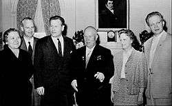 On the 100th anniversary of the hotel in 1993, one publication wrote: "It isn't the biggest hotel in New York, nor the most expensive. But when it comes to prestige, the Waldorf-Astoria has no peer. When presidents come to New York, they stay at the Waldorf-Astoria. Kings and queens make it their home away from home, as have people as diverse as Cary Grant, the Dalai Lama and Chris Evert. Some of them liked the hotel so well, they made their home there."[161] From its inception, the Waldorf was always a "must stay" hotel for foreign dignitaries. The viceroy of China, Li Hung Chang stayed at the hotel in 1896 and feasted on hundred-year-old eggs which he brought with him.[20] Over the years many royals from around the world stayed at the Waldorf Astoria including Shahanshah of Iran and Empress Farah, King Frederick IX and Queen Ingrid of Denmark, Princess Astrid of Norway, Crown Prince Olav and Crown Princess Martha of Norway, King Baudouin I of Belgium and Queen Fabiola, Prince Albert and Princess Paola of Belgium, King Hussein I of Jordan, Prince Rainier III and Princess Grace of Monaco, Queen Juliana of the Netherlands, King Michael of Romania, Queen Elizabeth II and Prince Philip of the United Kingdom and Commonwealth realms, Mohammed Zahir Shah and Homaira Shah of Afghanistan, King Bhumibol Adulyadej and Queen Sirikit of Thailand, and Crown Prince Akihito and Princess Michiko of Japan and many others.[162] Queen Elizabeth II and Prince Philip stayed at the hotel during their first visit to America on October 21, 1957, and a banquet was held for them in the Grand Ballroom. In the Bicentennial year in 1976, most of the heads of state from around the world and all of the Kings and Queens of Europe were invited to the hotel, and it also served the presidential candidates in the run up to the elections of that year.[163]