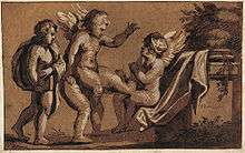 Chiaroscuro woodcuts are old master prints in woodcut using two or more blocks printed in different colours; they do not necessarily feature strong contrasts of light and dark. They were first produced to achieve similar effects to chiaroscuro drawings. After some early experiments in book-printing, the true chiaroscuro woodcut conceived for two blocks was probably first invented by Lucas Cranach the Elder in Germany in 1508 or 1509, though he backdated some of his first prints and added tone blocks to some prints first produced for monochrome printing, swiftly followed by Hans Burgkmair.[10] Despite Giorgio Vasari's claim for Italian precedence in Ugo da Carpi, it is clear that his, the first Italian examples, date to around 1516[11][12]